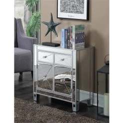 Convenience Concepts Gold Coast Vineyard Two-Drawer Cabinet In Mirrored Glass And Silver Wood Finish