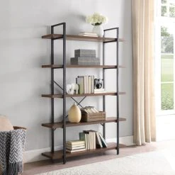 Belleze Industrial Bookcase Open Etagere Book Shelf Metal/Wood, Dark Walnut, 5 Shelves