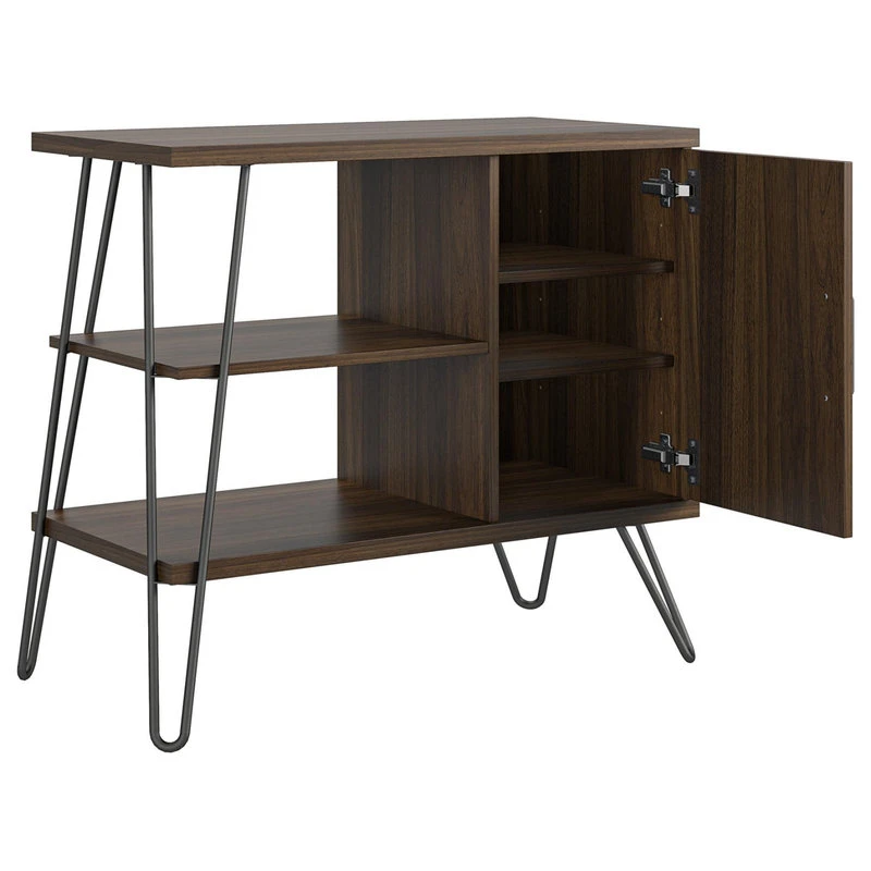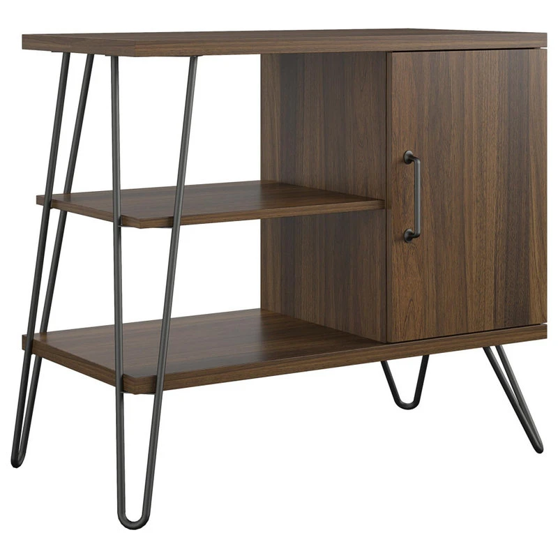 - The finish on the laminated particleboard pairs with the powder-coated metal hairpin legs for a fun retro look.
