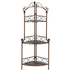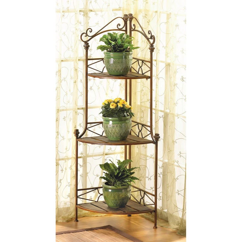 Metal Corner Baker Rack Shelf UnitPerfect for smaller spaces, this rustic baker’s rack unit tucks neatly into a corner. Warm wood tones and interesting scrollwork. Great for plants!
