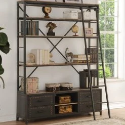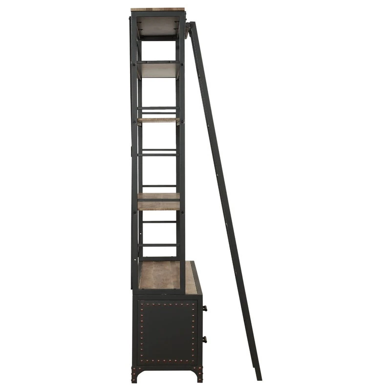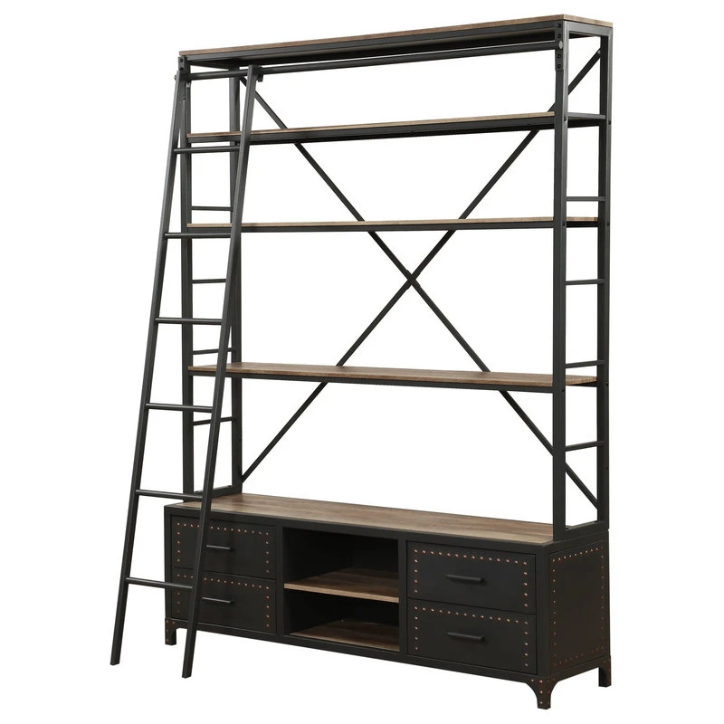 Depict the gentle flow of industrial modern decor with the Actaki bookshelf and ladder set. Industrial modern shelving unit with 4 drawers with nail-head trim and 2 open shelves provide a unique storage and display to you room. Some assembly required.
