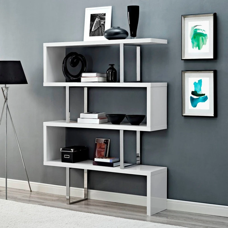 Pursue adventure at every turn with the Bookshelf. Symmetrically designed to imbue a fluid sense of movement, outperforms other bookshelves and stands by the sheer nature of its design. Made of durable fiberboard, with walnut grained or white veneer, is made secure by polished steel supports that steady the progressive nature of this piece. Perfect for contemporary living rooms, proudly displays books and accent pieces, while leaving guests to marvel at this winding conversation piece.