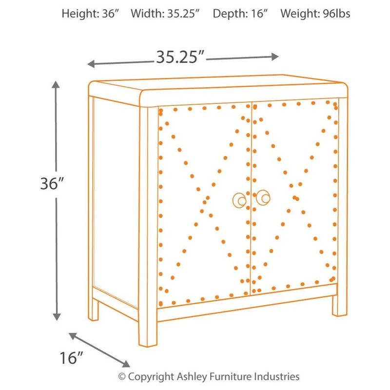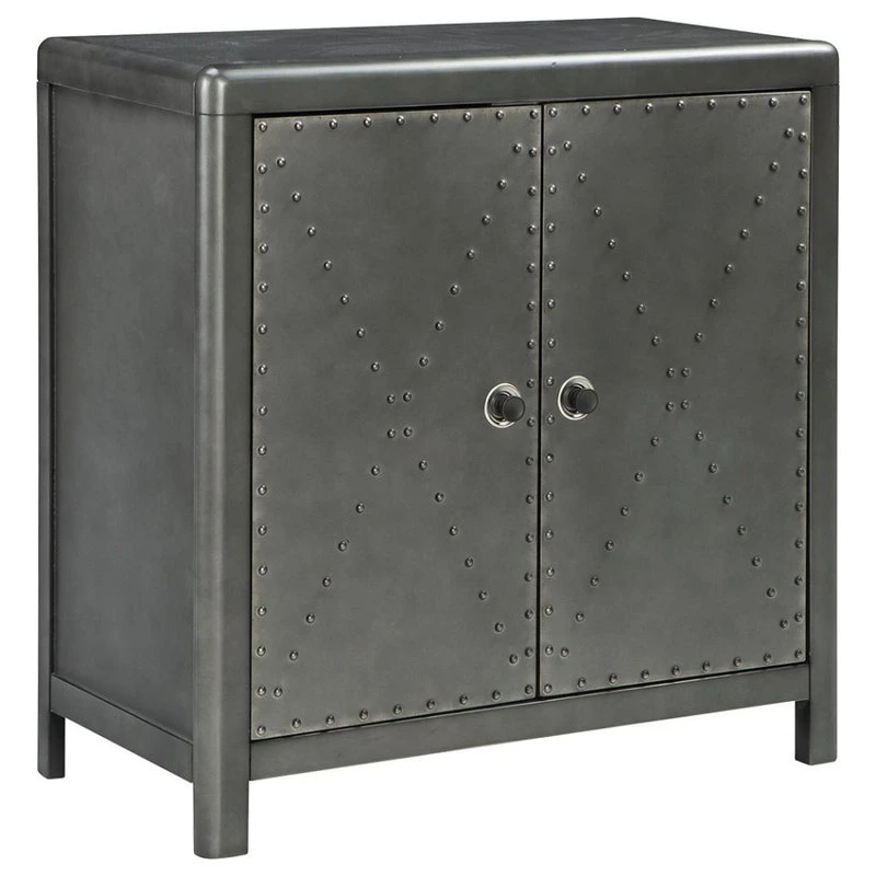 Whether storing plates and linens in the dining room, toiletries in the bathroom, or supplies in the home office, the Rock Ridge 2-door accent cabinet works a modern industrial look loaded with versatility. Antique gunmetal finish—punctuated with nailhead accents and round, recessed handles—wows with retro-chic charm.