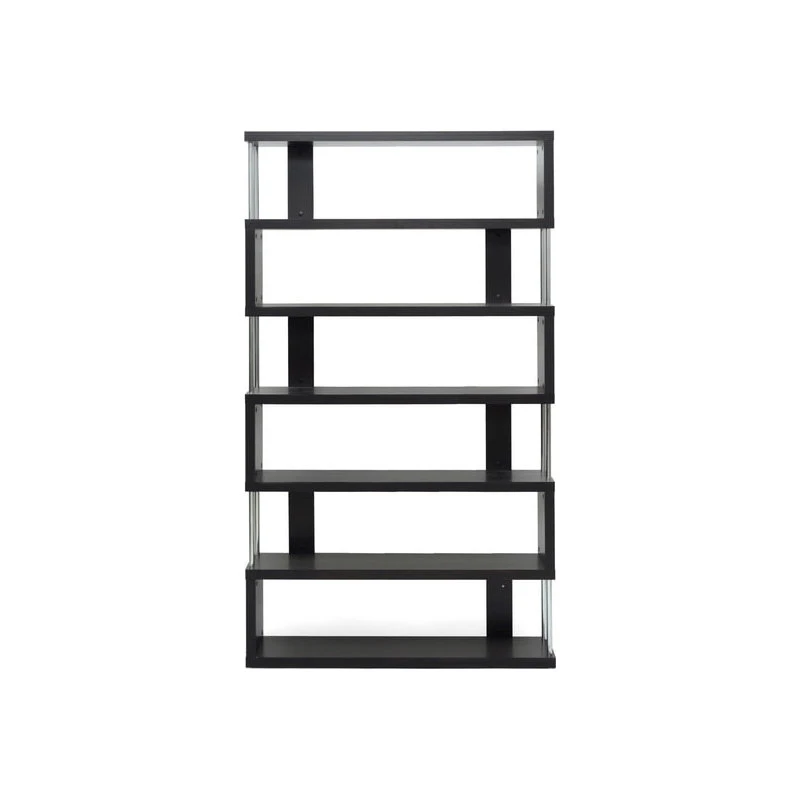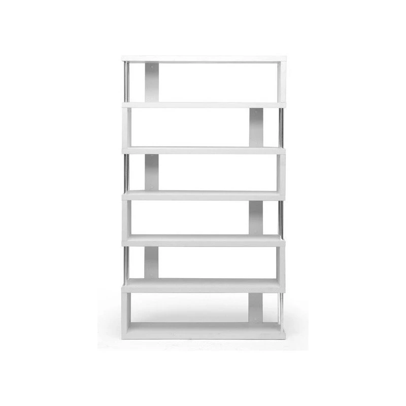 This artsy, modern bookcase gets you organized with style. Our Barnes Bookcase is made of white paper veneer over an engineered wood frame and features chromed steel side supports. Not only does this modern display shelf house books, but it is also the perfect place to show off your prized vases, decor, and home accents. The Barnes Bookcase is Malaysian-made, requires assembly, and should be dusted with a dry cloth. Separately offered is the Barnes Bookcase with three shelves as well as the Barnes Bookcase in dark brown.