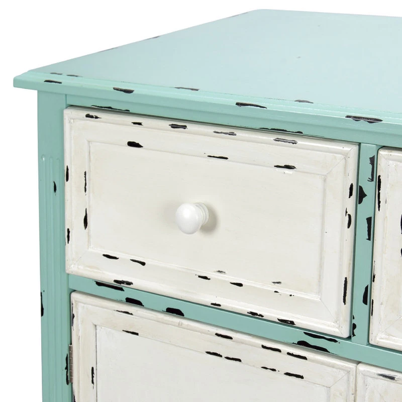 Organic-inspired distressed blue and cream finish wood 2 cabinet, white lateral drawers above butted doors, knob pull, and light blue overhang top, frame and cabriole legs.