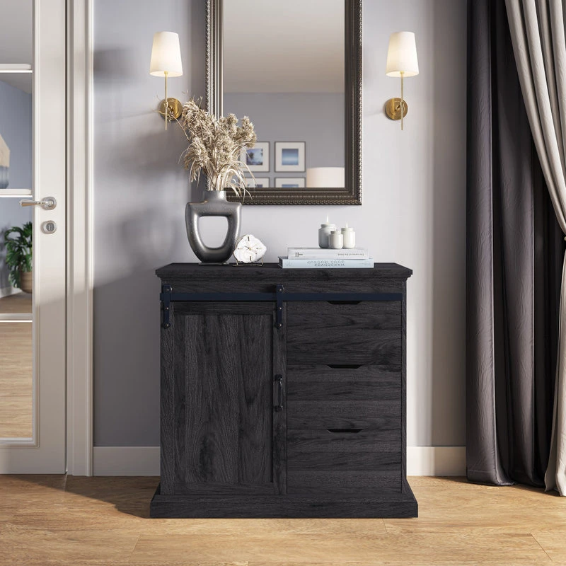 - [SLIDING BARN DOOR] The sliding barn door and dark hardware give this storage cabinet a mix of rustic charm and industrial edge. Slide the door to reveal the storage shelves, which offer the perfect place to store serveware, liquor or other household items.