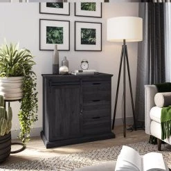 With threee built-in drawers and an adjustable shelf, this cabinet provides a convenient way to hide all of the clutter while saving space. The sliding barn door is mounted on elegant dark hardware. Behind the door you’ll find two convenient storage shelves, which provide a place to tuck away glassware, serveware or liquor. You can easily adjust the shelf to suit your needs.