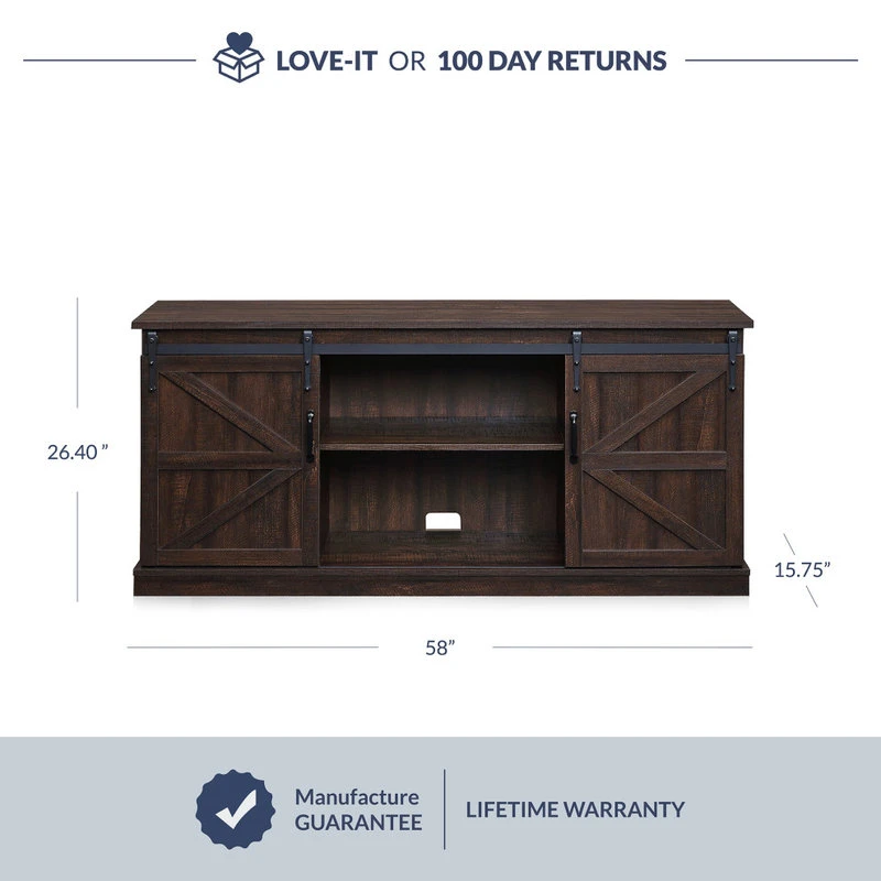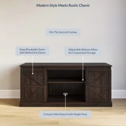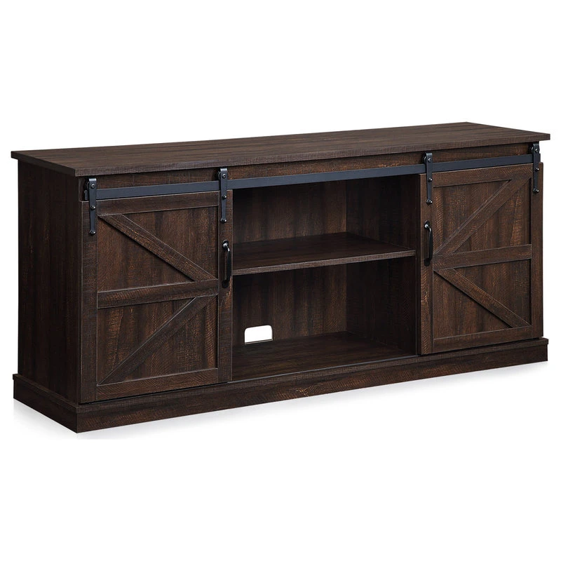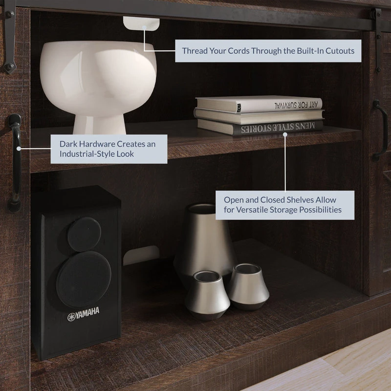 Suited for modern farmhouse and industrial spaces alike, this TV stand is a versatile pick for the living room. Crafted from manufactured wood, it features a pair of barn-style doors that slide shut for added appeal, while metal hardware completes the aesthetic. Adjustable shelves give you space to set up media players and keep your collection of DVDs on display, and cable management cutouts in the back help you keep your space clutter-free.