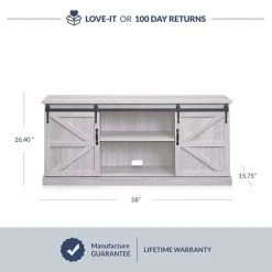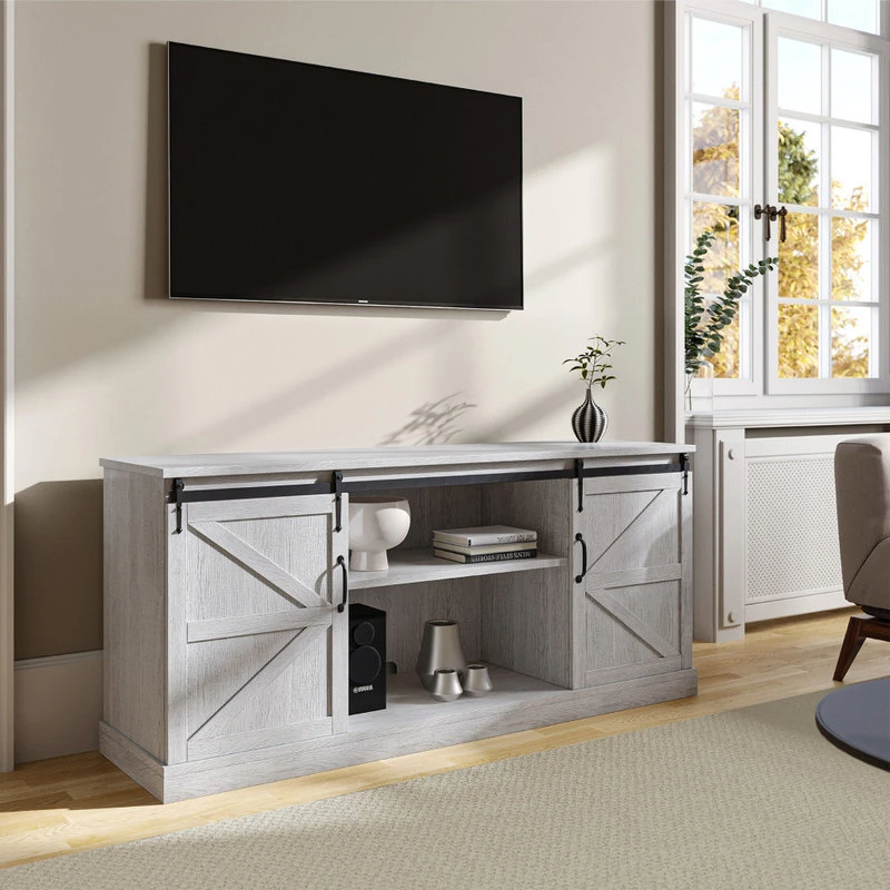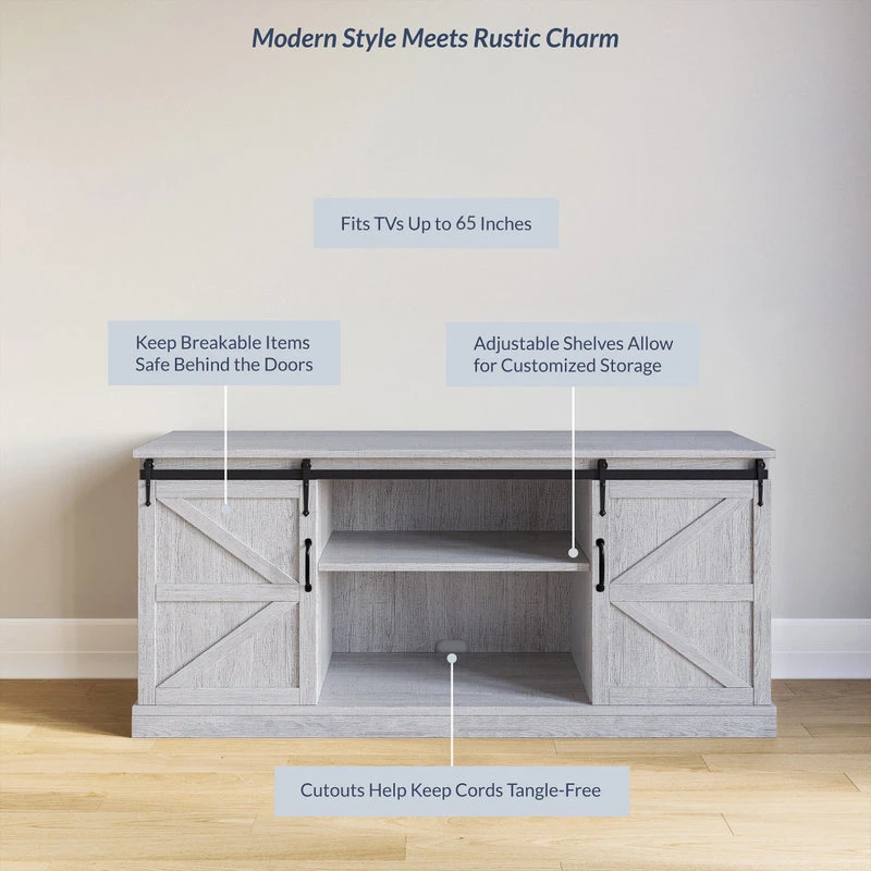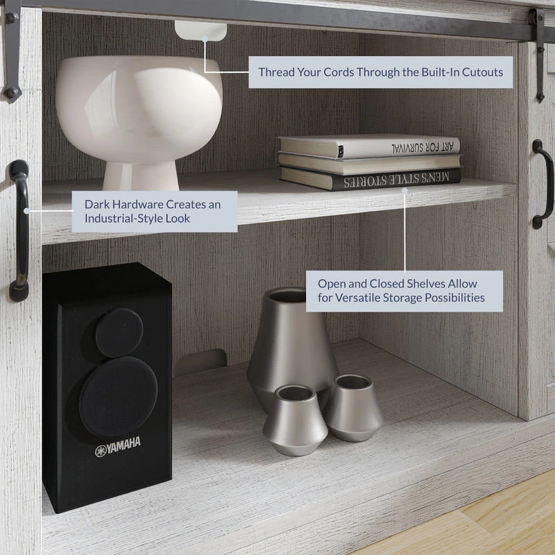 Suited for modern farmhouse and industrial spaces alike, this TV stand is a versatile pick for the living room. Crafted from manufactured wood, it features a pair of barn-style doors that slide shut for added appeal, while metal hardware completes the aesthetic. Adjustable shelves give you space to set up media players and keep your collection of DVDs on display, and cable management cutouts in the back help you keep your space clutter-free.