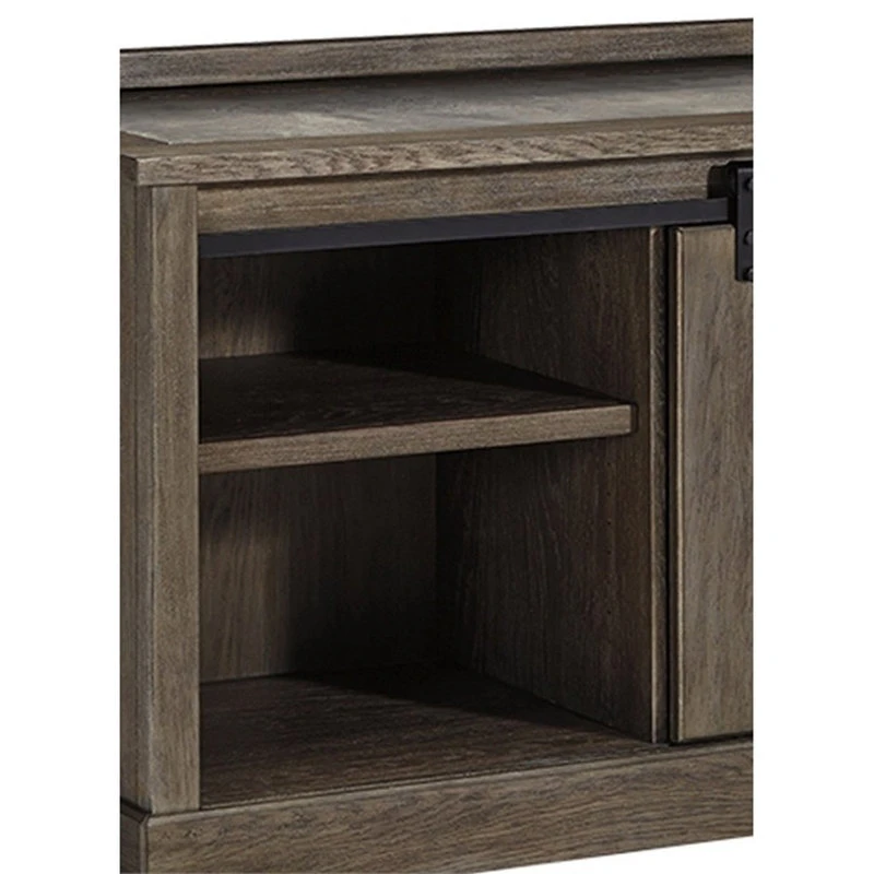 Who says you have to live on a farm to have farmhouse style? Get the look with this trendsetting large credenza with hutch. Distressed gray brown finish and faux bluestone top inset express character. Charming barn door slides to reveal your home office equipment or dining essentials. Hutch shelves put your books or dinnerware on display. Yes, this good-looking set is suitable for multiple rooms.