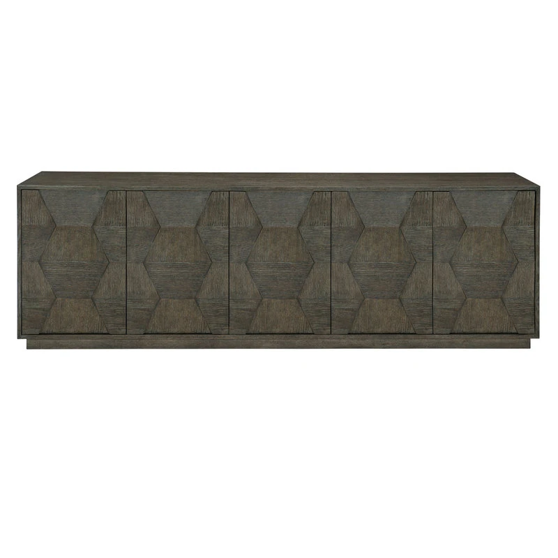 Five push-to-open doors with dimensional fancy face door fronts. Behind each paired end doors and center door are two adjustable/removable, vented shelves with ventilation holes and grommet holes with covers in back panel for wire management.