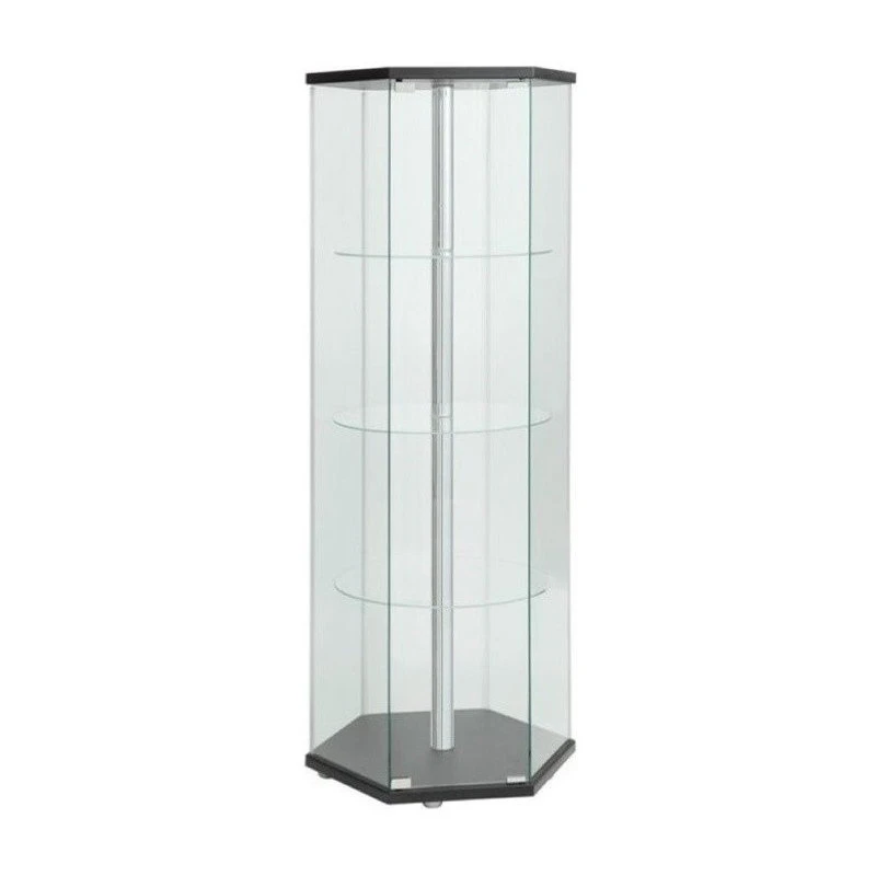 Explore the cutting edge properties of geometric design. Made from glass, this curio cabinet wakes up a contemporary space and puts a new spin on an old classic. Hexagonal in shape, it features a cool center pole for visual effect. A black finish top and base provide superb contrast. Display favorite decor on a trio of round glass shelves. This Bowery Hill Contemporary Wood Glass Hexagonal Curio Cabinet in Black and Chrome will be a undoubtedly a great addition to your home dΓ©cor. Add a touch of elegance to your home setting. The modern design showcases for a timeless aesthetic that goes with a wide range of decor themes. It has a simplicity and a flare all at once, as if inspired by the simple gown that is confident in taking up its space.