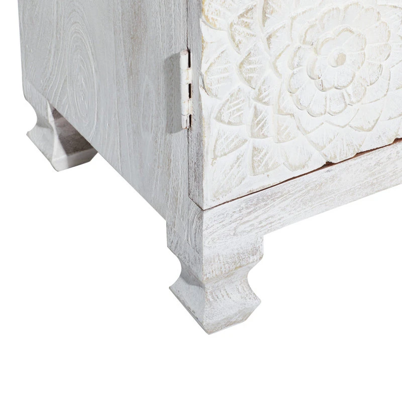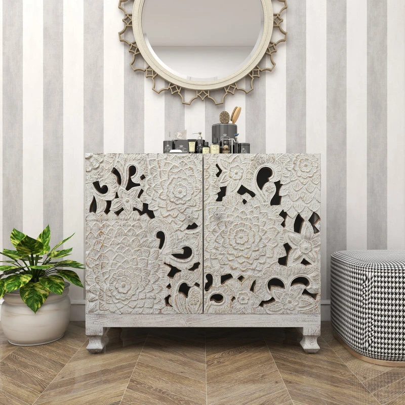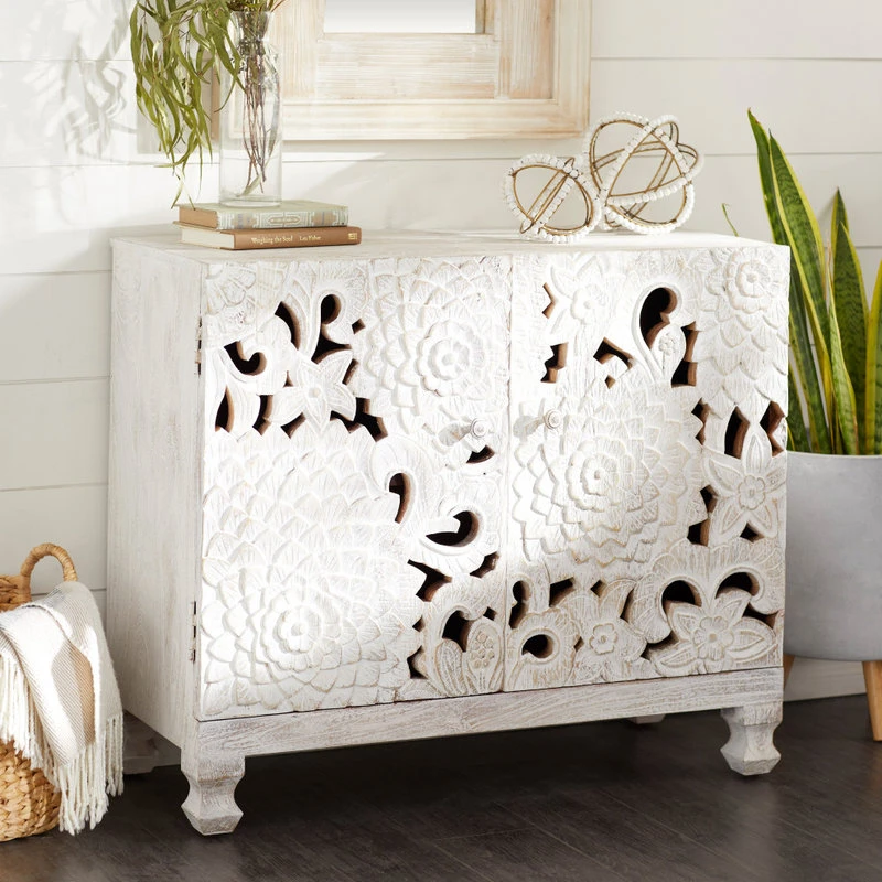 A practical yet stylish upgrade that instantly elevate the look of your room. Maintain a clutter free zone and stay organize with this chic cabinet. Arrange this floral cabinet in your entryway, lobby, living room, reading room, or home office. It is ideal to display small planters or ornaments on top to complete its country cottage look. Designed with felt or rubber stoppers at the base that prevent scratching furniture and table tops, as well as sliding around. This accent furniture features interior space with 34.25”L x 13.87”W x 10.50”H measurements. This item ships in 1 carton. Furnished with round pull handles and stable curved feet. Suitable for indoor use only. Maximum weight limit is 100 lbs. Made in India. This is a single cabinet. Wood cabinet features a single shelf. Mediterranean style.
