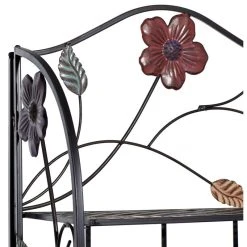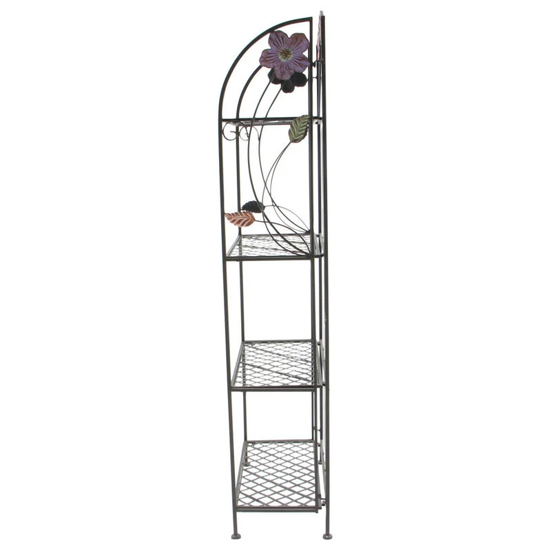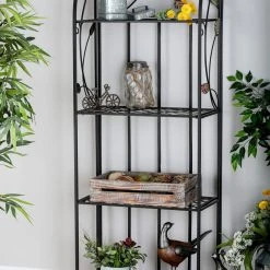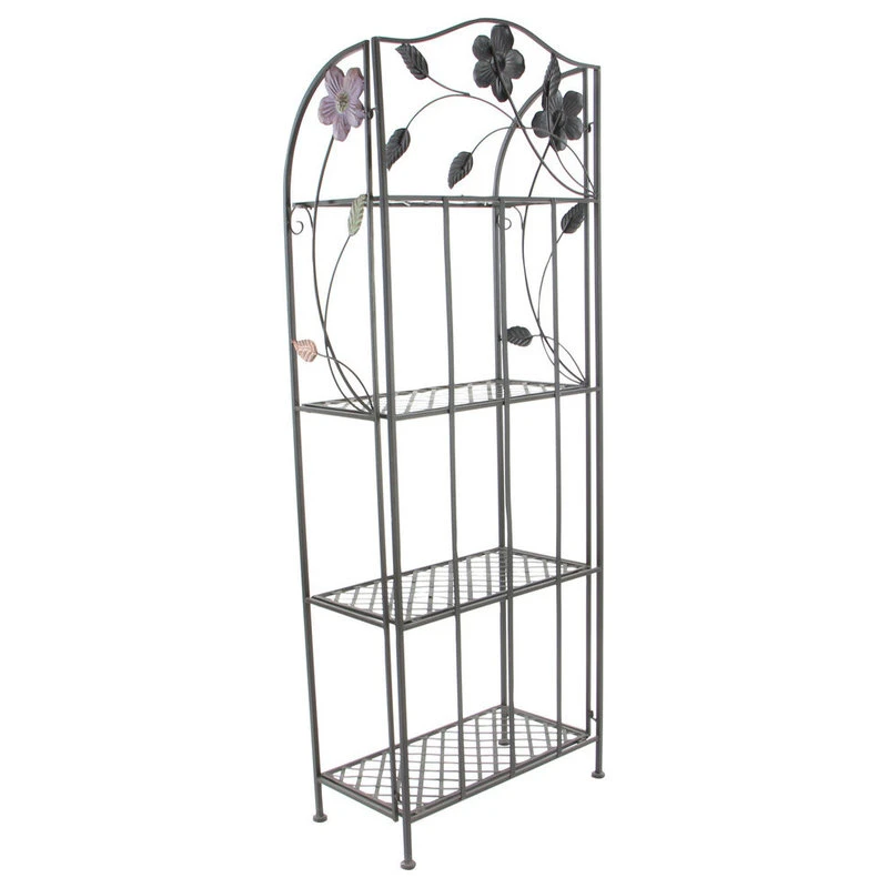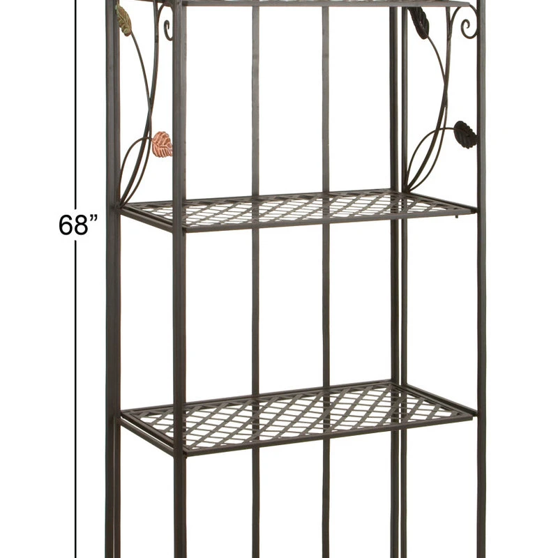 A storage piece that is spacious to keep your valuable organized and safe. Appreciate their design best against solid-colored backgrounds. Display this traditional shelving rack inside or out and filled with bright-colored potted cacti and flowers. Designed with felt or rubber stoppers at the base that prevent scratching furniture and table tops, as well as sliding around. This item ships in 1 carton. Large, decorative metal indoor and outdoor storage unit with 4 rack shelves. A great versatile decor for indoor or outdoor display but are not rust or weather resistant. Maximum weight limit is 40 lbs. This is a single bakers rack. Iron bakers rack features 4 shelves. Traditional style.