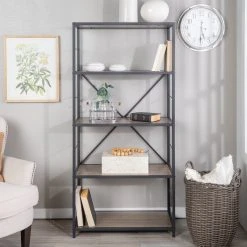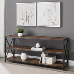 Walker Edison 60″ X-Frame Metal And Wood Media Bookshelf, Rustic Oak