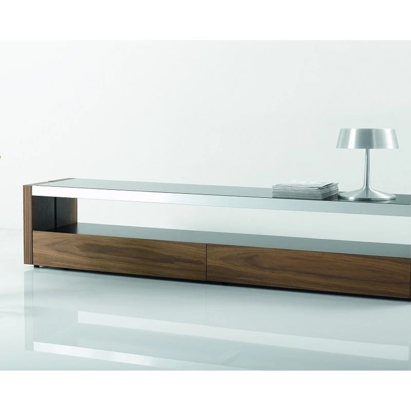 Crafted in a matte walnut veneer with a black glass top inset in an aluminum frame the Trieste TV Base is classy, sophisticated & yet simple. This TV unit features a wide matte black shelf with plenty of space for media devices, and 2 deep drawers with soft closing tracks for storage.