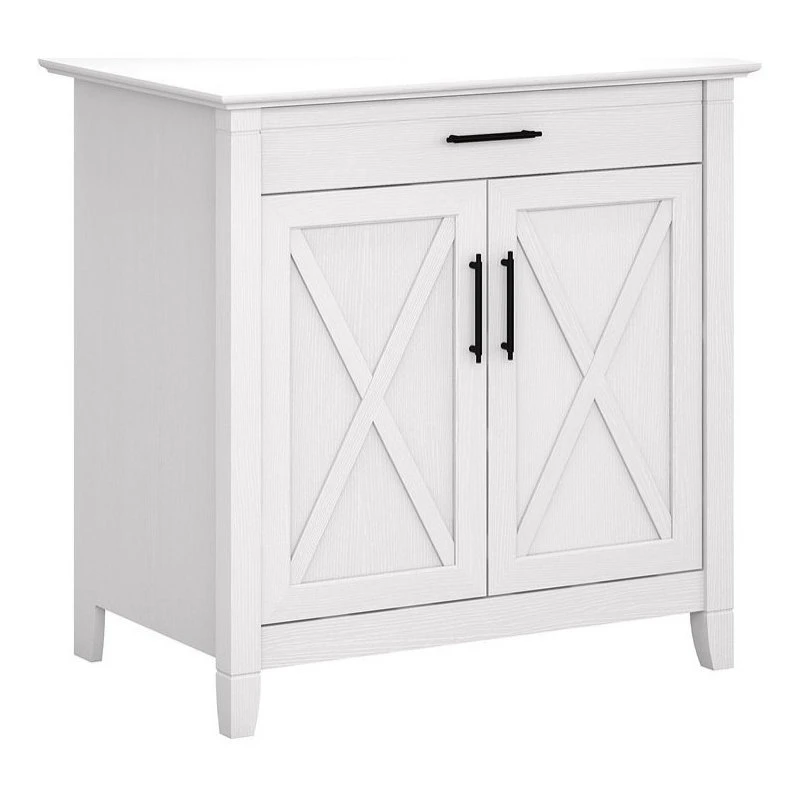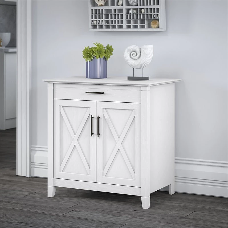 Use the compact Bush Furniture Key West Secretary Desk with Keyboard Tray and Storage Cabinet to create an office as big or small as you want. This small computer desk provides a central location for your laptop and is a casual storage solution that works subtly in any room. The convenient pull out Keyboard Tray with flip down front folds up neatly when not in use and includes wire management. The drawer opens on full-extension ball bearing slides for an easy reach to contents and reliable everyday use. The built-in storage cabinet features one adjustable shelf to help you organize work materials and supplies of various sizes. Unique X pattern accents on the door panels give the armoire desk a relaxed style with a sturdy and attractive post leg design. This Desk with Storage is tested to meet ANSI/SOHO quality standards for safety and performance and is backed by a 1 Year Warranty.