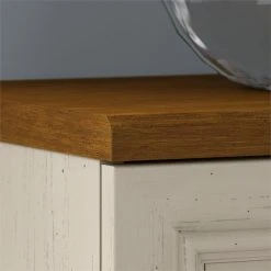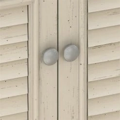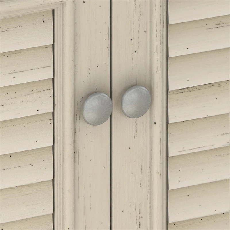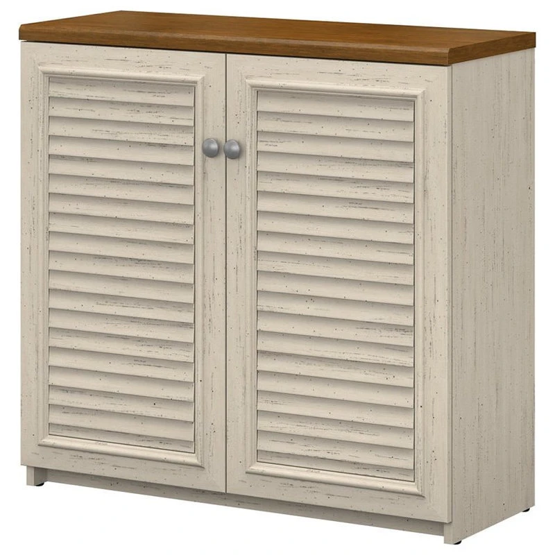 With its practical design and casual appearance, the Bush Furniture Fairview Small Storage Cabinet with Doors offers a versatile solution to organizing your home. A slightly weathered finish with Antique Pewter hardware brings about the welcoming charm of modern farmhouse styling, while a durable build and functional features ensure the 2 door Storage Cabinet will have long lasting appeal. The low profile design works well in small spaces while still providing ample storage capacity, making this accent cabinet a good fit for an entryway, office, living room or bedroom. Elegant louvered doors on Euro style hinges open to reveal three shelves, two of which can be adjusted to hold items of different sizes. The top of the Storage Cabinet offers a sturdy surface with enough space to display your favorite trinkets and mementos. Available in attractive Antique White/Tea Maple and Antique Black/Hansen Cherry finishes, the Small Storage Cabinet with Doors works well on its own or it can be matched with coordinating items from the Fairview Collection to extend your home’s laid back cottage ambience. This organizer has been tested to meet ANSI/SOHO standards for safety and performance and is backed by the Bush Furniture 6 Year Manufacturer’s Warranty. Materials: Engineered Wood and Laminates