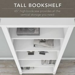 Turn any space into your own personal library with the Bush Furniture Somerset 5 Shelf Bookcase. With a tapered leg design and your choice of Maple Cross, Hansen Cherry, Mocha Cherry, Ash Gray and Storm Gray finishes, this tall bookshelf is a perfect choice to complete your home office. Two shelves are fixed to provide structural strength, and three are adjustable so your items are sure to fit. The height of the Bookcase matches that of a Somerset Desk and Hutch combination (sold separately) to create a coordinated appearance. Its sturdy construction and durable laminate finish allow you to display books, decorations and more for years to come. This tall Bookcase is tested to meet ANSI/SOHO quality standards for safety and performance and is backed by the Bush Furniture 6 Year Manufacturer’s Warranty. Add the 5 tier bookshelf to your existing decor or expand your home office with a broad range of coordinating desk and storage options from the Somerset Collection. American made with U.S. and imported parts.