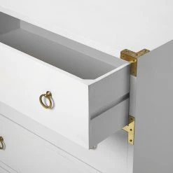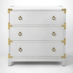 This three-drawer campaign chest is a stylish addition in virtually any contemporary space. Featuring a Glossy White finish with polished gold ring pulls and corner brackets, it is crafted from mango wood solids and wood products.