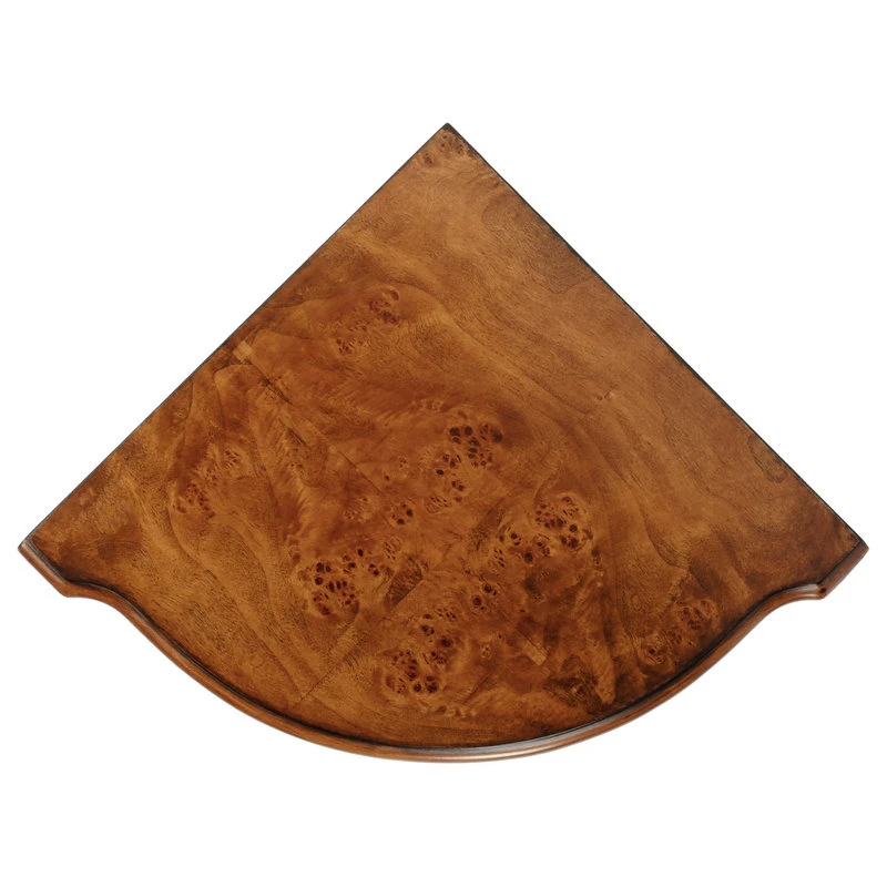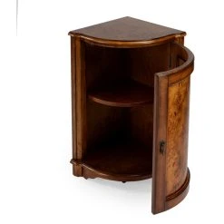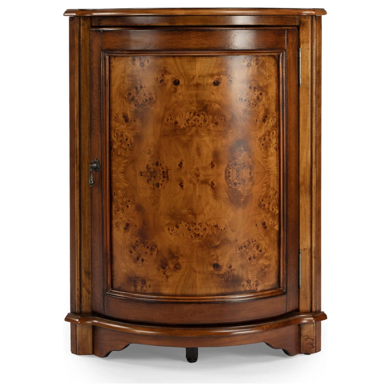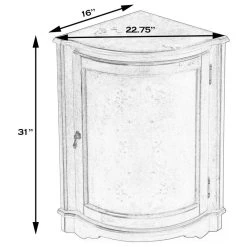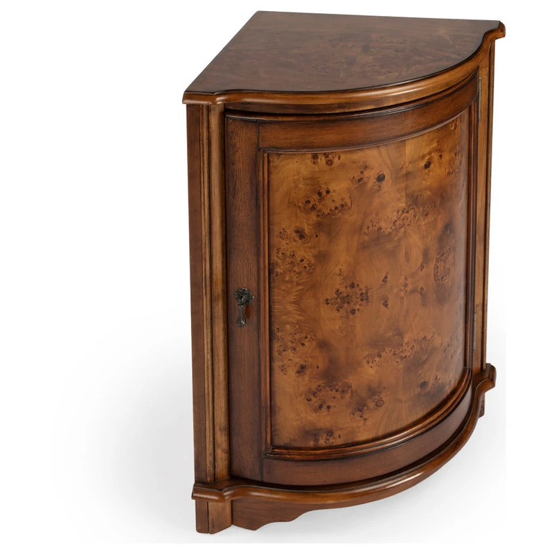The Durham Olive Ash Corner Cabinet was crafted as a classic cornerstone piece to employ and enjoy in the home for generations. The triangular shape of this table fits perfect in any corner, which also makes it viable for any room in the house. The table has ample storage at the bottom in the form of a cabinet. The door, adorned with a pull in an antique brass finish, opens to reveal a shelf within its always welcome storage space. This cabinet is constructed out of wood solids and veneers.