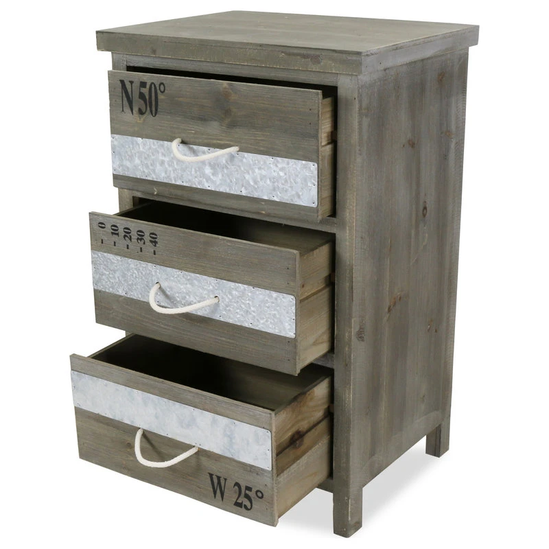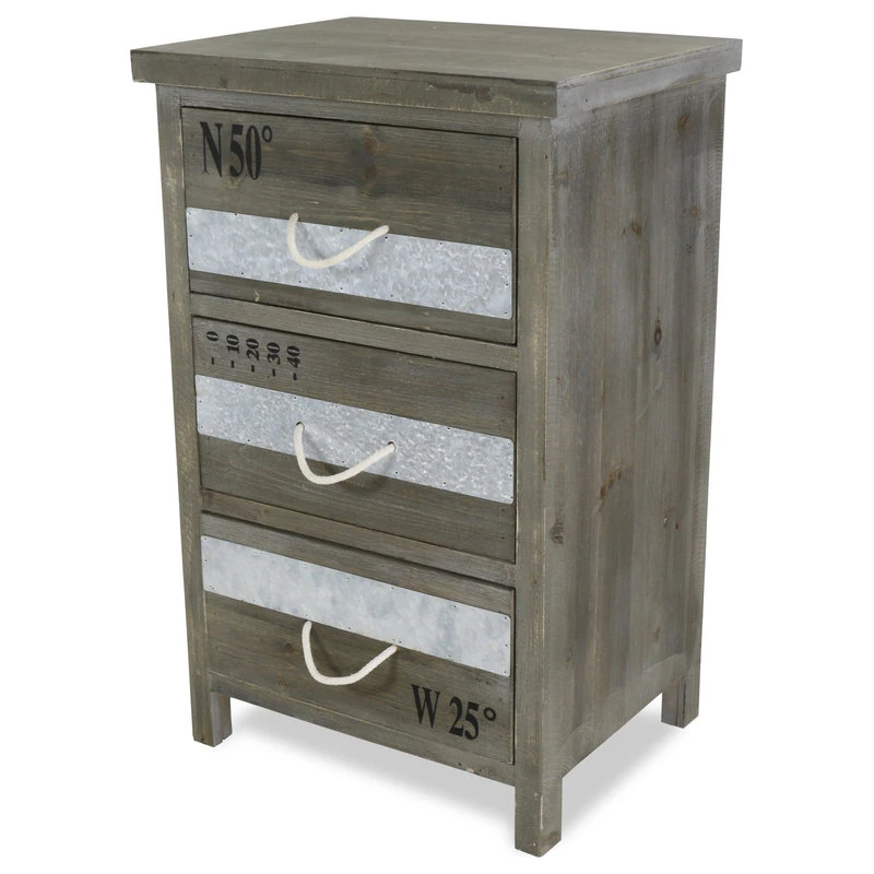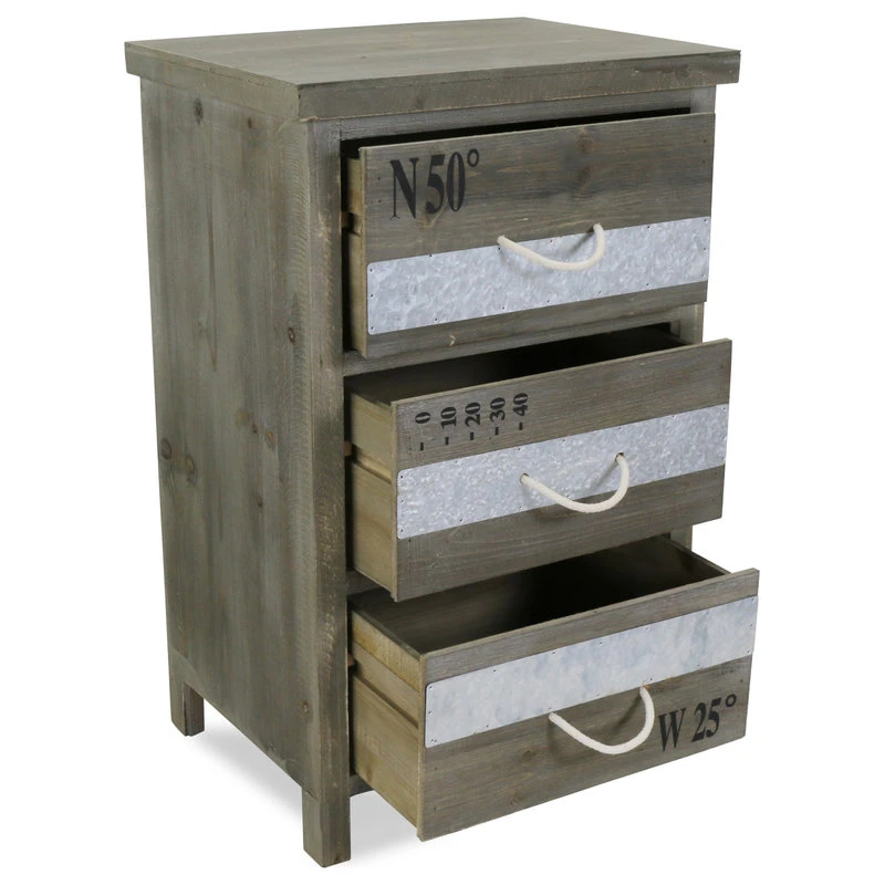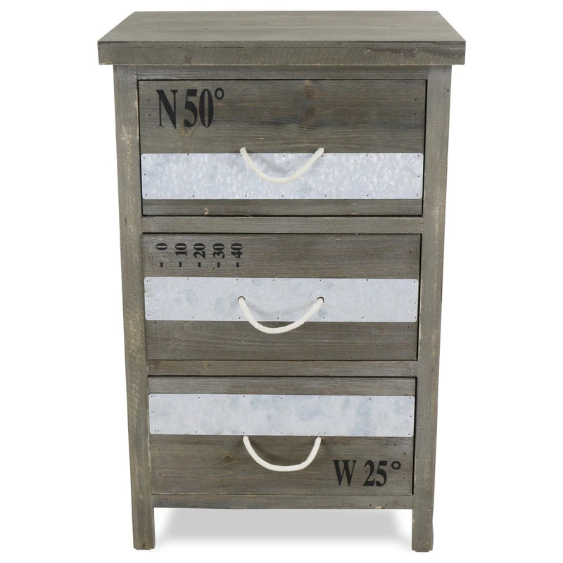 Add a touch of rustic, industrial charm to your home with the 3-Drawer Rope Handle Wooden Cabinet. A lovely addition to your living room or bedroom, the 3-Drawer Rope Handle Wooden Cabinet is eye-catching in design and versatile in function. Featuring three spacious drawers, the 3-Drawer Rope Handle Wooden Cabinet offers ample storage space perfect for clothes, linens and other accessories. Wooden drawers adorned with stenciled coordinates, rope drawer pulls and metal trim accents provide an additional layer of design depth and will effortlessly enhance your industrial, rustic or eclectic home decor.