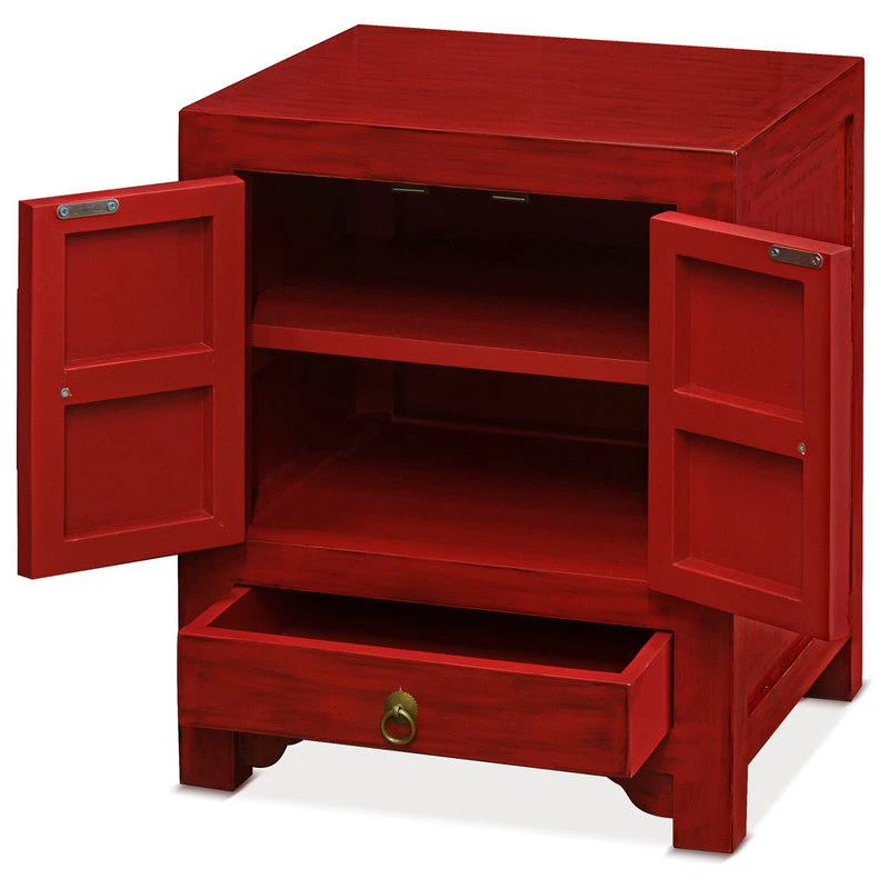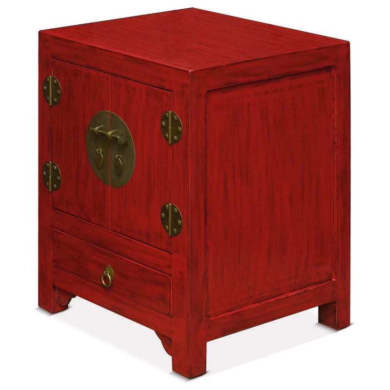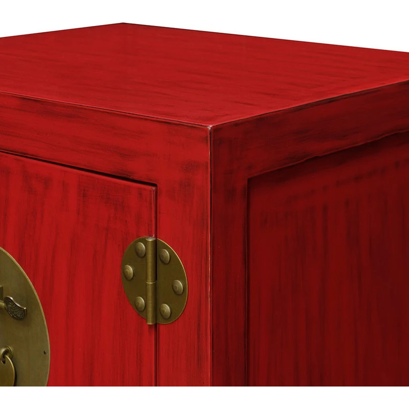 The characteristics of the furniture style of Empire of the Great Ming, a ruling Dynasty of China from 1368 to 1644, are simple, clean and pleasing lines. Our reproduced Ming cabinet is a fine example of the simple, elegant design with antique brass hardware and hand-painted distressed Chinese red finish, which strongly states the contemporary decorative style. Hand-crafted in Elmwood, this piece not only serves as a function of art but also as practical storage in any room.