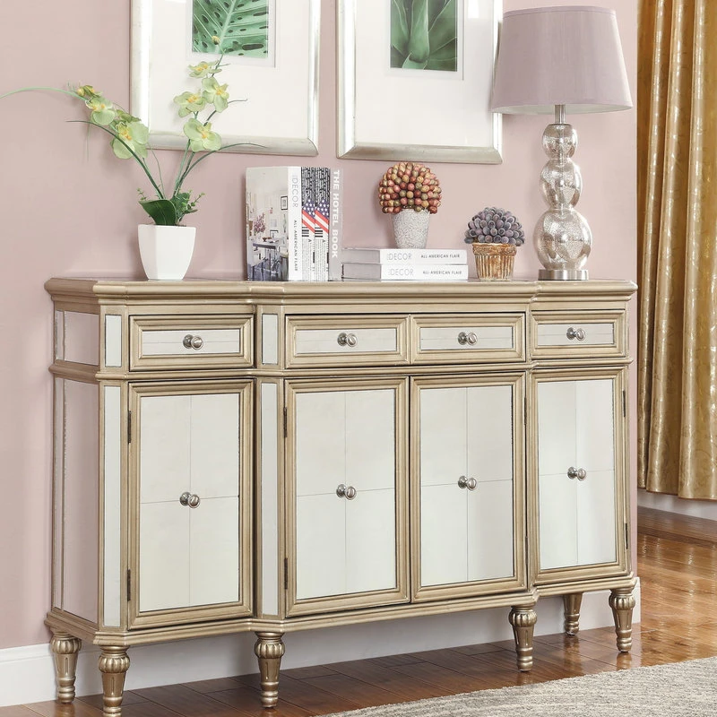 With four drawers and four doors which open to reveal adjustable shelving, you will have ample storage space in this extraordinary credenza. Estaline Champagne and Mirror finish, a multi-dimensional front, turned and tapered feet and polished silver hardware provide style add a splash of glamour to any home.