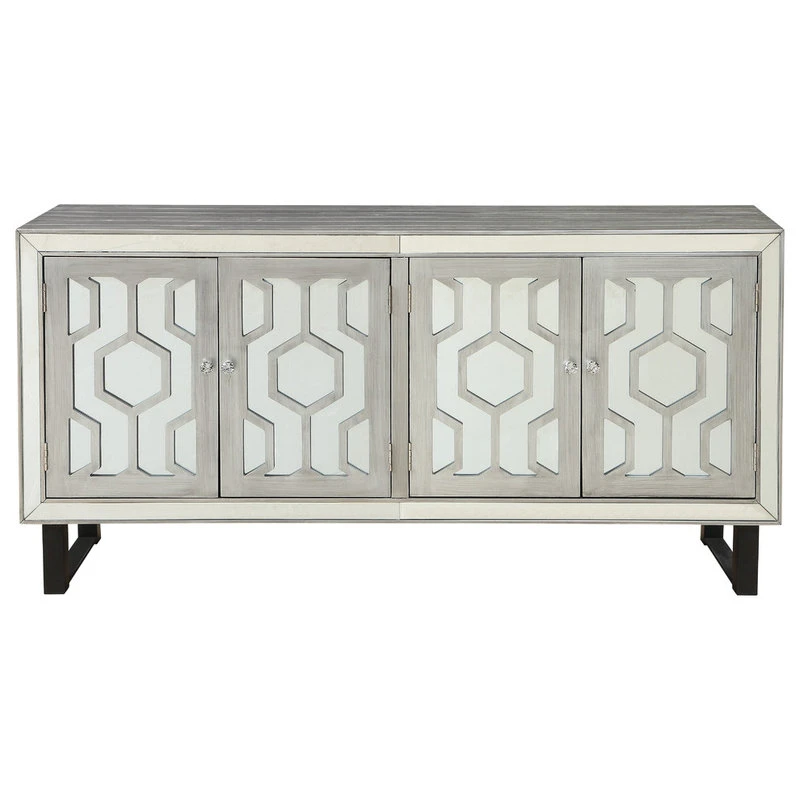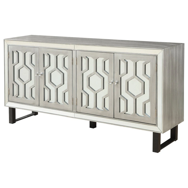 Eclectic style with a dash of charismatic glamour, our Four Door Media Credenza takes center stage! Finished is a Bose Metallic Pewter, this credenza features a grooved design that rises up the sides and across the top, mesmerizing overlays on the mirrored door fronts, faceted crystal hardware, and dark metal legs that hold it all aloft. A class act to enhance your entry, entertainment area, or dining room with impeccable style.