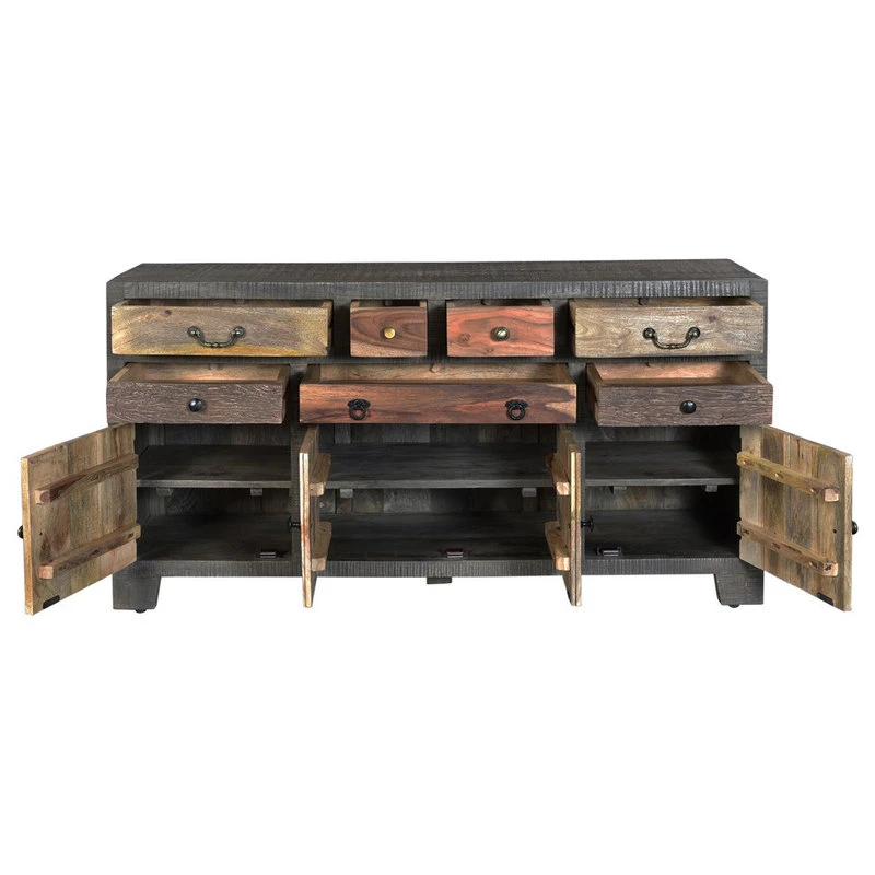Bring the beauty of nature directly into your home with our Woodland Natural finished sideboard. The surrounding frame is built from solid Mango in a stone grey finish. Each of the seven drawers showcase a natural finish on a variety of wood species. You will find Sheesham, Acacia, Mango and Sheesham bark each sporting an eclectic mix of hardware. The four doors open to large storage compartments with a removable shelf. Store your linens, dinnerware, games, memorabilia and more in this stunning tribute to the nature’s natural beauty.