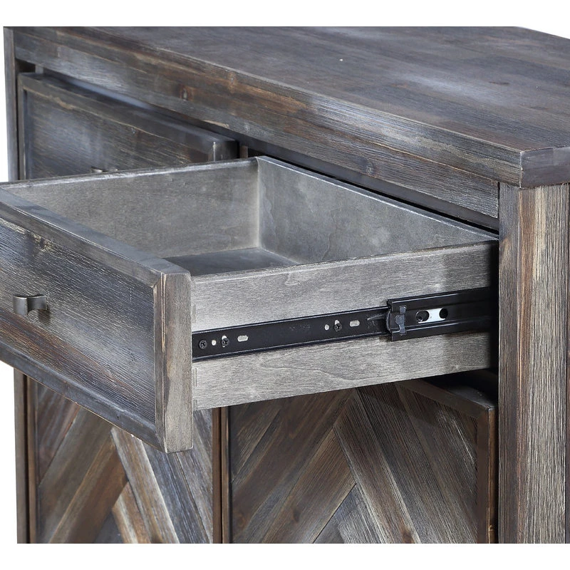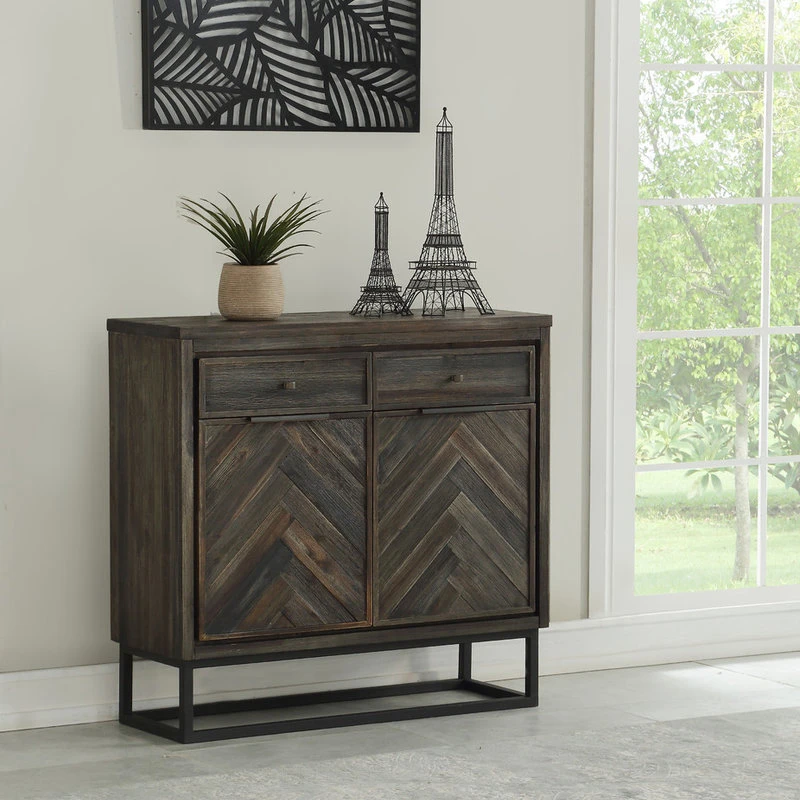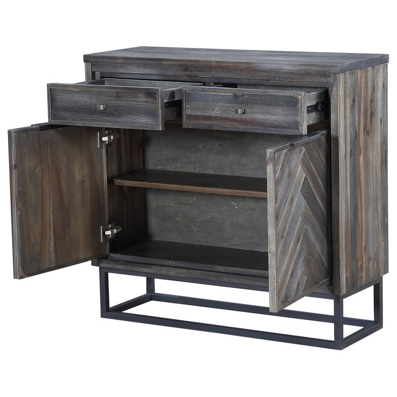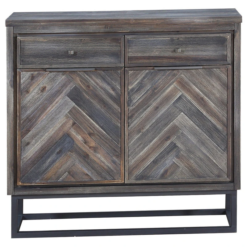 The Aspen Court Herringbone finish and dark metal open base gives a much sought after vintage weathered look to our Cabinet. Perfect for your den or game room, with two chevron patterned doors below that open to a shelved interior for storing games, extra pillows or books. Plus, with two roomy drawers above, you can keep notepads, pens and remotes close at hand but neatly out of sight.
