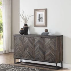 The chevron patterned door fronts highlight the light and dark shades of the Aspen Court Herringbone finish, adding a subtle patterning to our Four Door Media Credenza. Floating above the open squared metal base, our stylish Credenza offers an abundance of storage with four interior shelves as well as a cord management system to keep unsightly wires under control.