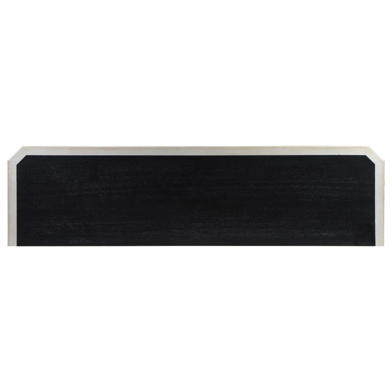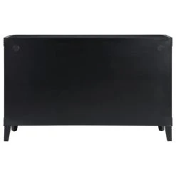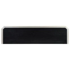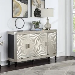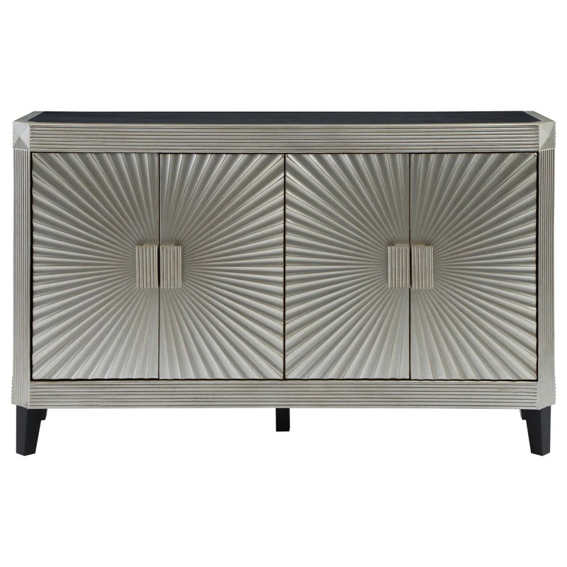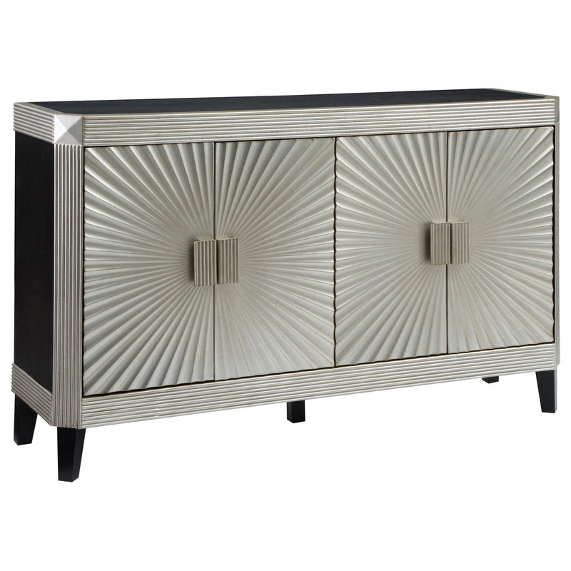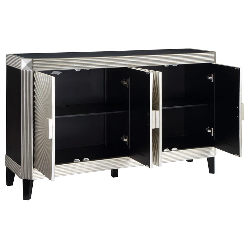 The only corners that have been cut here are on the beveled edges! Finished in our Rockwell Silver with black accenting the sides, top and legs, this Credenza is going to be a focal point for any room. Grooved borders frame the surfaces, and fan out from central oversized matching hardware on the four door fronts for a radiant display. With a spacious shelved interior for storage, this Credenza will be a family favorite on so many levels!