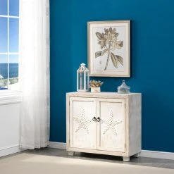 Keeping it light with our Stars of the Sea Two Tone finish, and playful with large raised starfish on the two door fronts, this Cabinet is an ideal addition for your sunroom or to freshen up your guest bath. A roomy shelved interior is perfect for those extra towels and toiletries, and the spacious top would look great with a bowl of colorful shell soaps, some scented candles, lotions and oils!