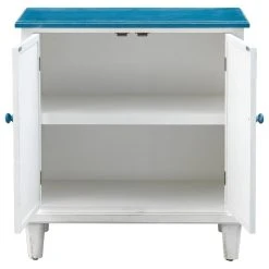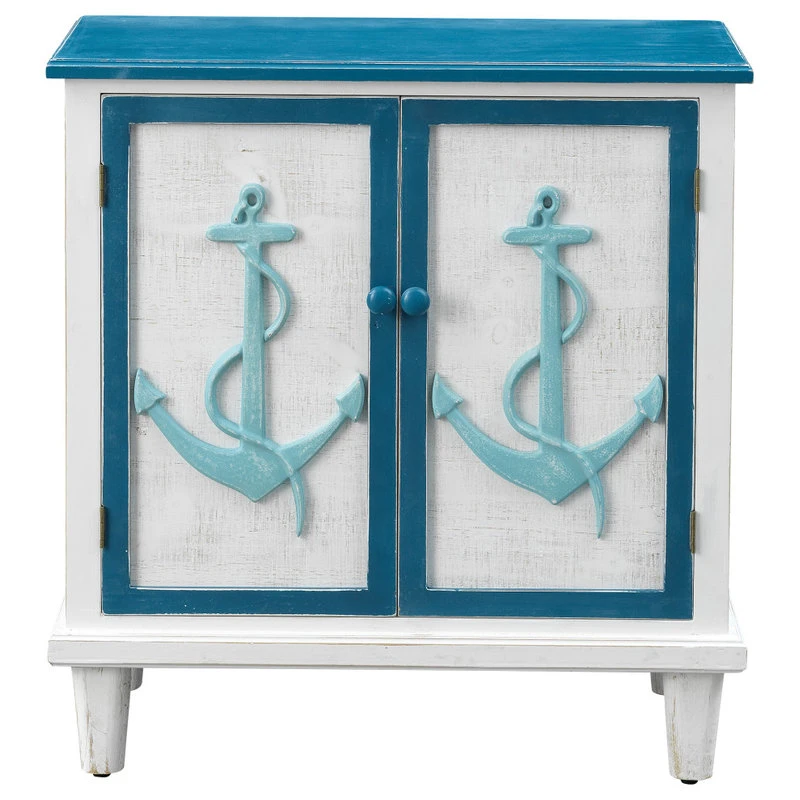 Add a smile to your dΓ©cor with this precious Two Door Cabinet finished in a distressed blue and white, and with anchors delightfully highlighting the two door facings. With a shelved interior for storage and a spacious top for display, this Cabinet is the perfect size and choice for your kitchen, bath or playroom.