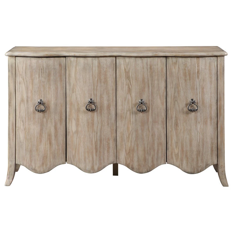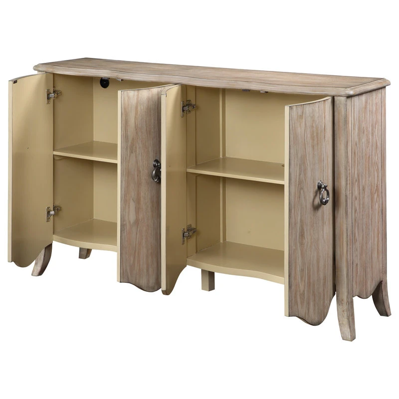 Natural wood graining is emphasized by the Cadence Distressed Soft Brown coating that covers this striking Media Credenza. Four doors cross the front, each of which has a deeply curved base, creating a flowing scalloped skirt that dances across the front. Against a brick wall in your downtown warehouse loft, or against the crisp white of your kitchen, this timeless Credenza will be all you have been looking for and so much more!