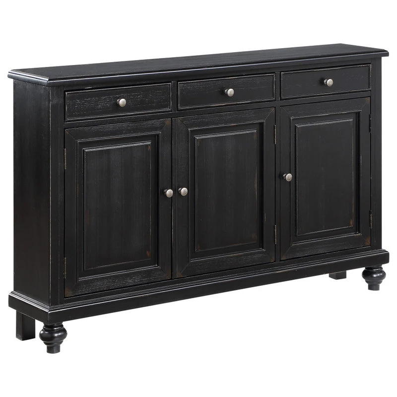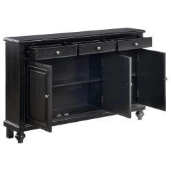 In your foyer, dining room or den, this roomy Credenza will be a welcome addition. Coated in our Raven Black Rub with turned ball feet, three panel doors that open to reveal a shelved interior, plus three upper drawers ready to hold everything form your guest napkins and candles to pens and papers, this handsome Credenza not only has the look you desire, but also the functional storage options you crave!