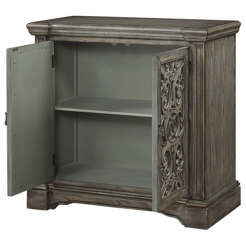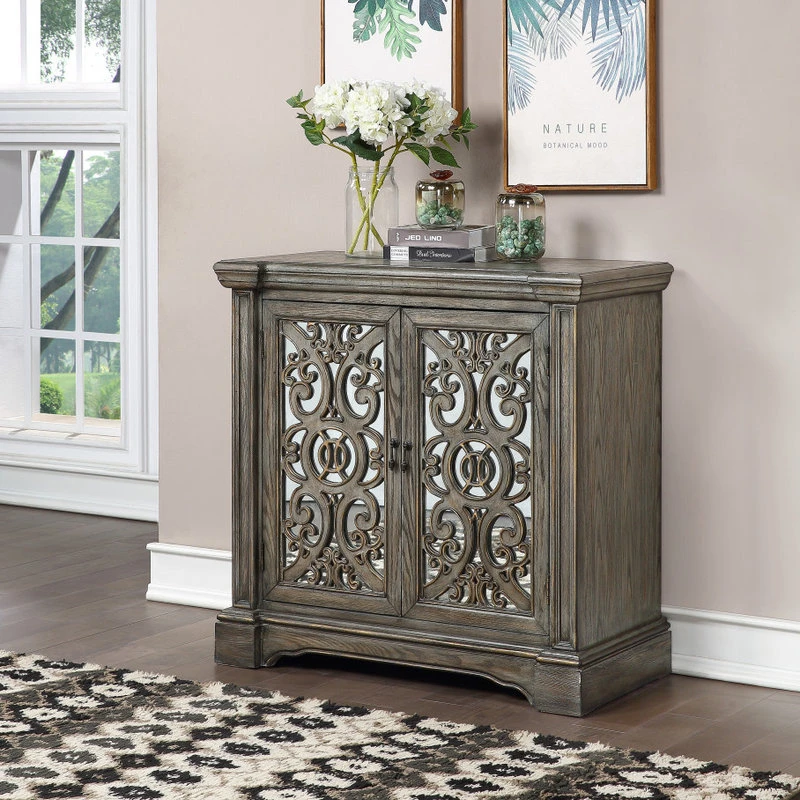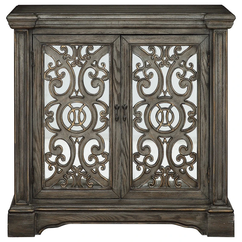 Beautiful fretwork circles and curls in a fanciful design on top of the mirrored door fronts, drawing your eye in and bringing a smile to your face! Finished in our Savannah Mist, the warm wood tones on this precocious two door Cabinet gleam, enhancing the classic features. Inside, a spacious shelved interior awaits, making this Cabinet an ideal choice for any decor.