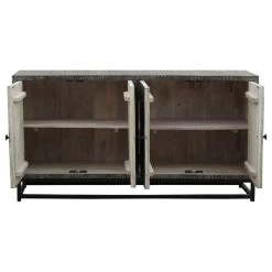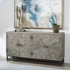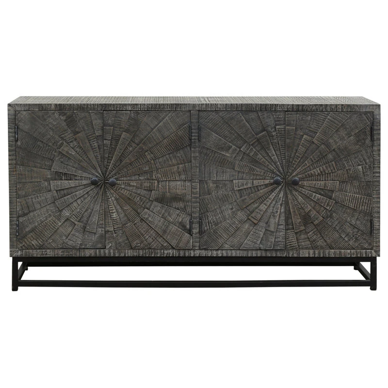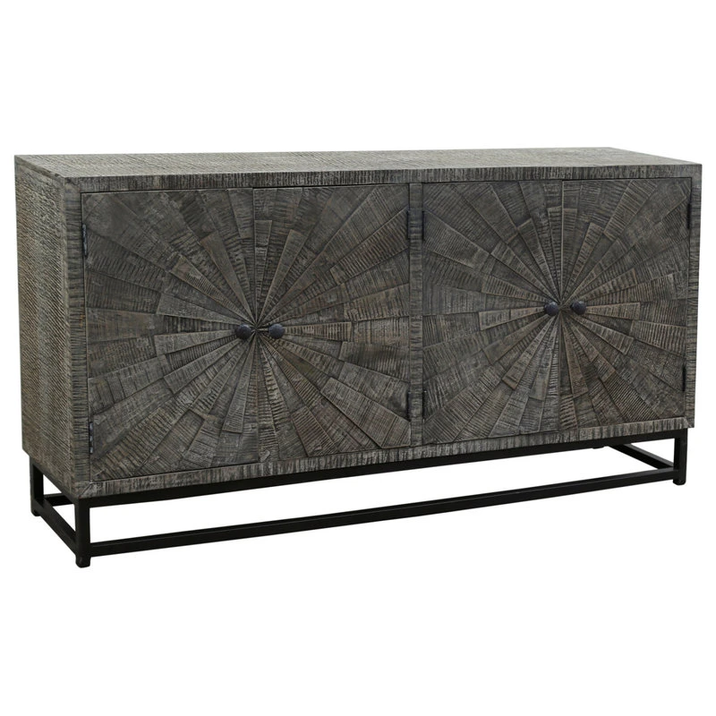 Edgy, with a rough hewn texture that wraps the surface of our Sideboard in a mesmerizing mix of chatter marks and ridges, giving heightened definition to the Spinner Brownish Grey finish. But what really draws you in, the patterns on the four door fronts seem to explode out from the centers, forming pieced together circular forms that are truly amazing! Such a find! And what a great piece for your entry or den!