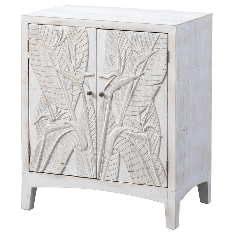 Our Tropics White Wash finish gives this Cabinet that fresh beachy appeal that will look so good in your sunroom or kitchen, whether you are near the ocean or just love that easy-going coastal vibe! Leaves carved in a high relief cover the two door fronts, artistic, yet ever so subtle. With a single fixed shelf inside for storage, this Cabinet is an excellent choice that you will enjoy for years to come!
