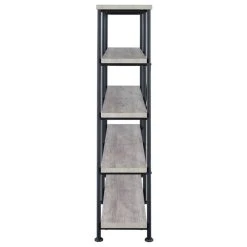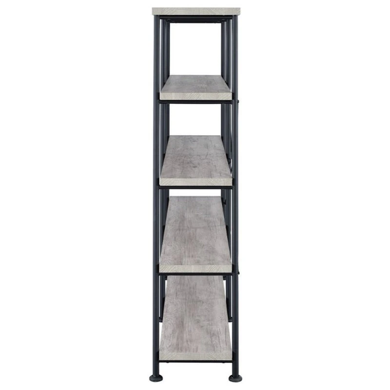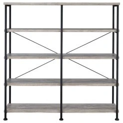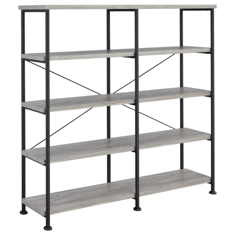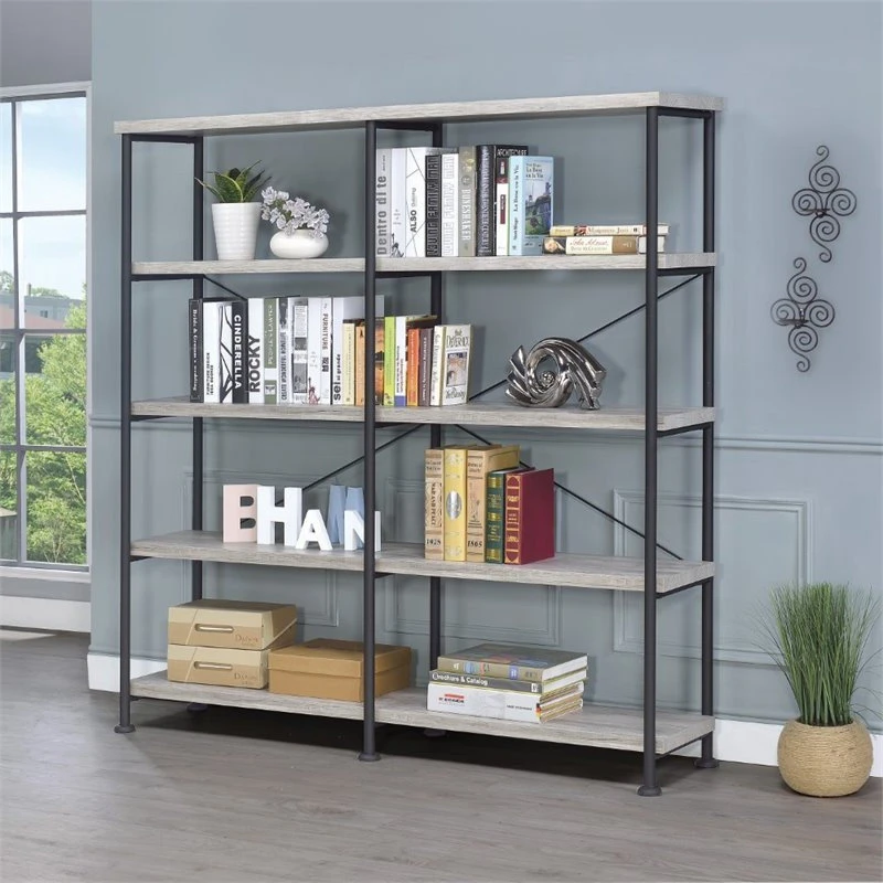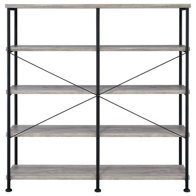 - Rustic industrial bookcase in gray driftwood with black metal frame boasts clean lines for your modern decor