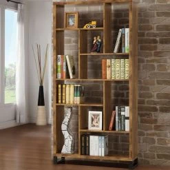 A unique, beautifully crafted design brings this bookcase to life. The shelf structure gives a range of options for displaying or storing goods, offering ten shelving areas for you to fill with books or collectibles. The bookcase is built of wood and finished in antique nutmeg, with metal legs finished in black.