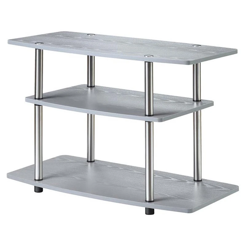 Optimize your space with the Designs2Go Three-Tier TV Stand from Convenience Concepts. Its open concept design and contemporary style will fit perfectly in your living room or home study. This piece features three tiers of shelving that provide ample space for all your entertainment essentials. Each shelf is constructed of particle board and melamine, giving this TV stand a lifetime of durability. The shelving is also supported by powder-coated stainless steel tubes that will not rust, while plastic caps with rubber soles cover the bottom to help protect your floors. Enjoy your favorite shows in no time with no tools needed for quick and easy assembly. Complete your modern space with coordinating pieces from the Designs2Go Collection by Convenience Concepts.