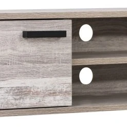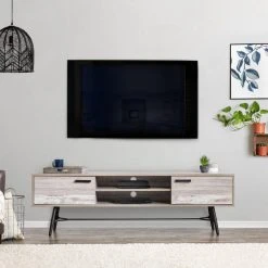 A mid-century modern design balanced with a warm rustic feel, this bench is a show-stopper in any entertainment or living room space. With ample storage and shelving space for all your A/V equipment. The beautiful duotone cabinet doors with high quality powder coated aluminum handles enclose the space to keep it organized, and splayed legs add support and style. Built to support TVs up to 85″.