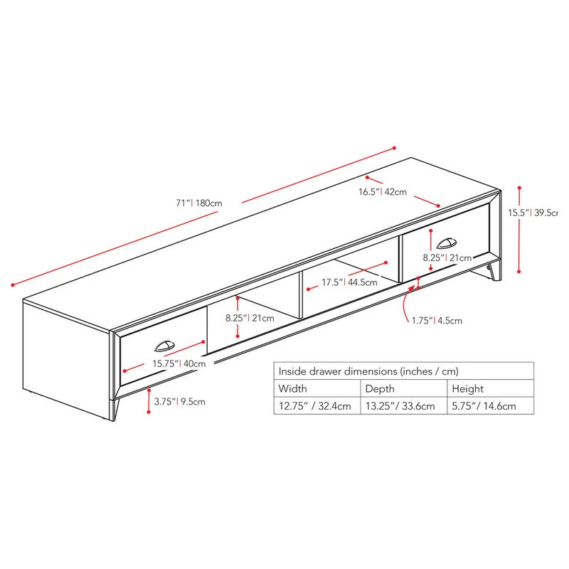 Admire the elegant modern design in the new TV Bench from the Lakewood Collection by CorLiving. This low profile extra long bench is featured in our Dark Wenge finish accented with imitation nickel handles, includes 2 drawers and 2 open center shelves. Offers a variety of open and concealed storage making it the perfect solution for a sleek appearance. This modern bench can accommodate most TVs up to 80″. Easy to assemble so you?ll be set up in no time.