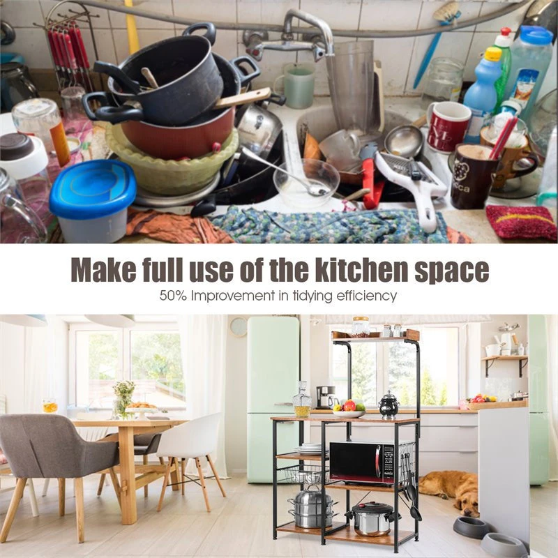 4-tier Storage Space: 3-tier shelves and 1 top shelf provide ample space for you to store your kitchenware such as microwave oven, pot, plates and food etc. Well-designed distance between each tier is high enough to accommodate big stuff. And the movable 5 S-shaped hooks for additional space to hang cooking spoons or kitchen towels. Fine Craftsmanship: Manufactured with P2 standard MDF with melamine cover and PVC margin-wrapping device, this microwave rack with steel tube supporting can hold up to 129 lbs. It is a great choice to be your Microwave Stand, Baker’s Rack, kitchen island, Spice Rack Organizer and kitchen storage shelf. Space-saving Kitchen Organizer: Multi-layer design allows your messy objects to own their place. And the floor area is merely 35.5″ (L) x 16″ (W) which won’t take up much space, but has four separated tier with a movable wire basket, which greatly classify your daily objects. Multipurpose Freestanding Shelf: The elegant and well-crafted appearance will add the distinctive flavor, elegance and balance to your decor and can harmonize with any other furniture in any room. Perfect served as bookshelf, office storage shelf in your home. Easy to Assemble: All parts and accessories are clearly listed on the instruction. Specific assembly steps are given for your reference. If you get any problem while assembling, you can contact customer service to help you.