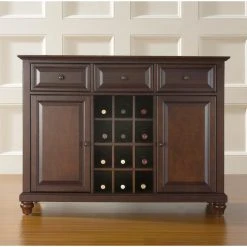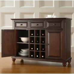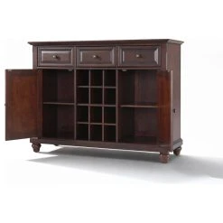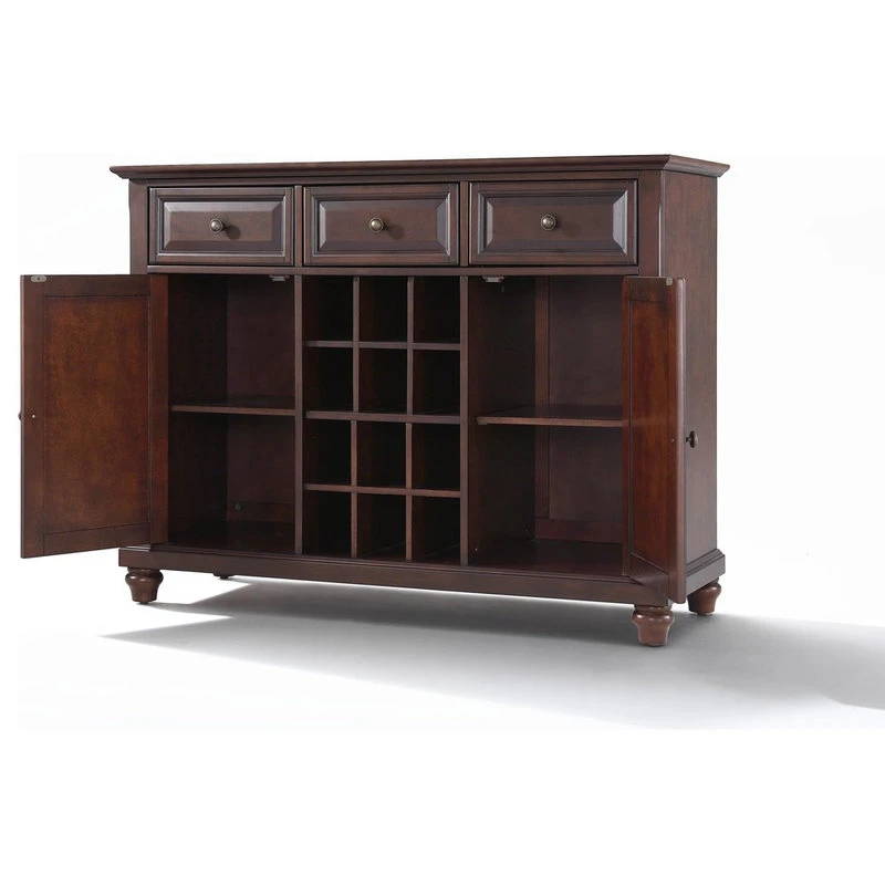 Constructed of solid hardwood and wood veneers, this Buffet Server / Sideboard Cabinet is designed for longevity. The beautiful raised panel doors & drawers, provide the ultimate in style to dress up your home. The three deep drawers provide an abundance of storage space. Behind the two doors, you will find adjustable shelves and storage space for things that you prefer to be out of sight. The center storage area is great for up to 12 bottles of wine, or if you prefer, remove the wine storage cubes to reveal an adjustable shelf. Style, function, and quality make this Buffet Server a wise addition to your home.