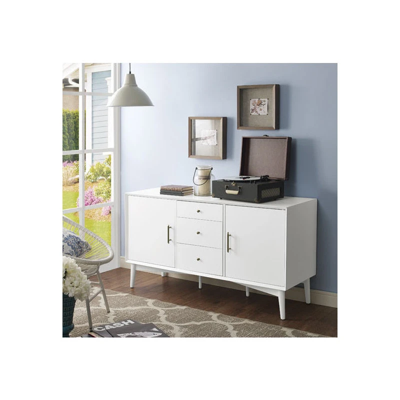 Mid-Century Modern style returns with Crosley’s Landon collection. The versatile Landon Buffet can serve as an innovative media cabinet or as a sleek side buffet. Along with the two spacious cabinets, the three center drawers roll out on full extension glides, giving easy access to every corner. The slender, round tapered legs and modern lines are echoed in the genuine metal drawer pulls and cabinet handles. With a beautiful smooth finish, the Landon collection is perfect for bringing elegant simplicity into any home.