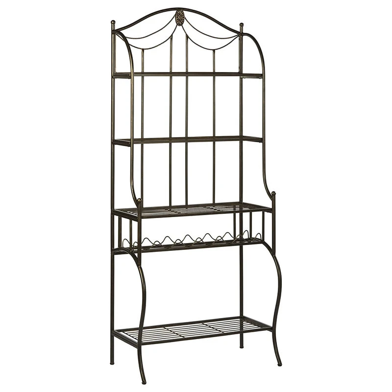 - Traditional metal baker’s rack featuring a rich black finish with gold accents
