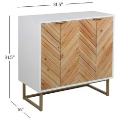 - Storage cabinet has a unique two-tone design with its painted white outer case and rustic fir solid wood doors weaved in a herringbone style and finished at the base with a gold metal foundation.